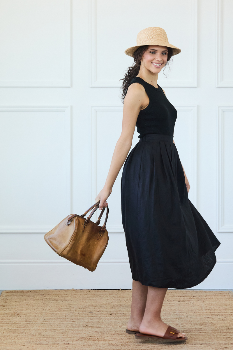 Our always-elegant Black Linen Pleated Skirt, made from 100% linen, makes dressing for any moment wonderfully effortless. Designed with delicate pleats at the waist and a chic A-line silhouette, it’s a timeless piece that combines comfort with style.